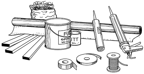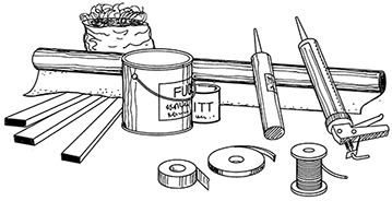 • Tettemateriale: dytt, dekklister, papp, folie, tape, masser eller tettelister som brukes til å tette (dekke eller fylle) fuge