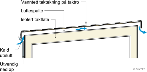 Prinsipp for oppbygning av slakt, luftet tretak med utvendig nedløp