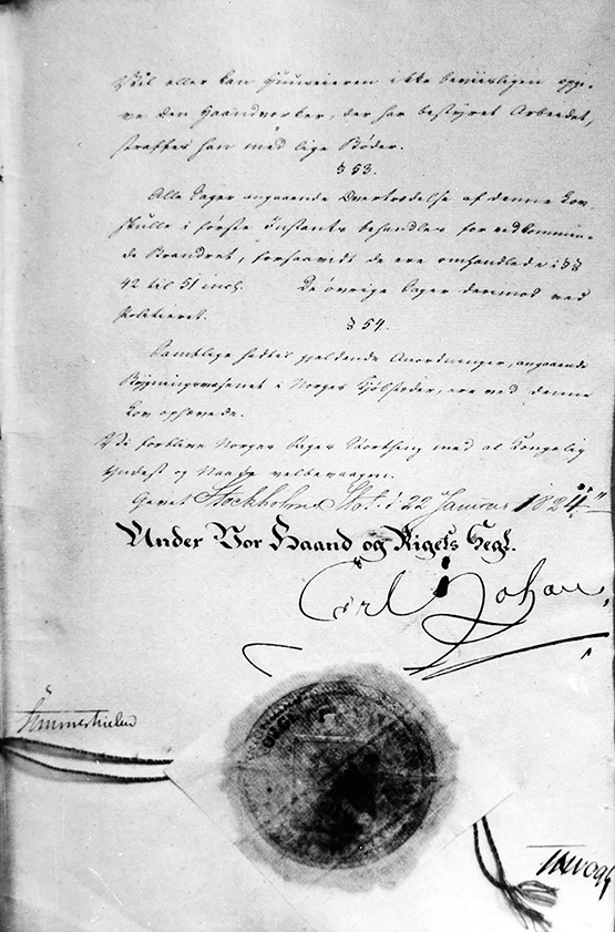 Siste side av den kongelige proposisjon til bygningslov for byene i Norge, forsynt med kong Carl Johans underskrift og segl