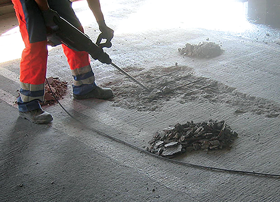 Fjerning av betong på oversiden av et betongdekke med elektrisk meiselmaskin. Foto: Stærk & Co AS