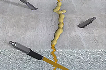 Hull for injeksjonspakkerne bores på skrått i betongen på begge sider av risset/sprekken slik at de krysser risset/sprekken. Det tettende injiseringsmaterialet pumpes inn i risset/sprekken ved hjelp av trykk som sikrer god inntrenging, utfylling og tetting av hele risset/sprekken i betongtverrsnittet. Foto: Sika Norge AS