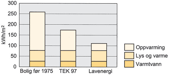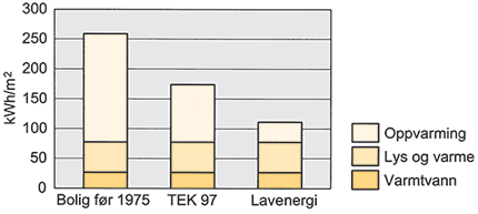 Eksempel på normal, årlig energibruk i småhus (135 m²) med ulik standard. Oslo-klima