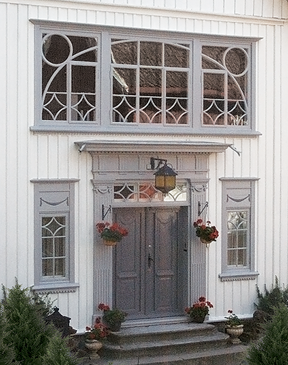 Den detaljrike utformingen av vindus- og dørpartiet viser at vedlikehold kan være utfordrende. Foto: «Gamle trehus» [941]