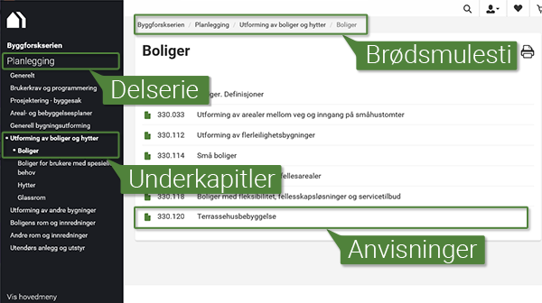 Du kan navigere i delseriene fra hovedmenyen (venstremenyen på desktop). Delseriene er delt inn i kapitler som igjen består av flere anvisinger. Du kan også navigere med brødsmulestien som viser hvor du er i Byggforskserien.